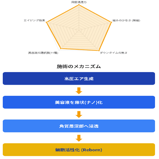 技術の秘密: 医師と共同開発された「ニードルレスインジェクター」を採用。高圧エアで美容液を霧状にして届けるため、針を使わないのに角質層までしっかり浸透します。